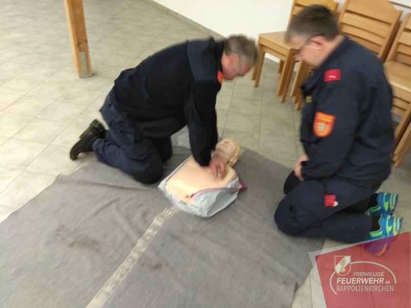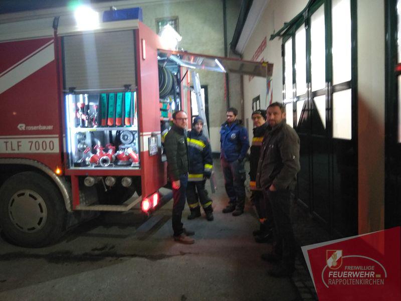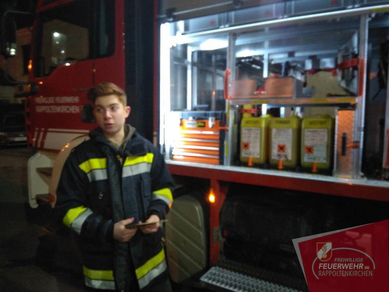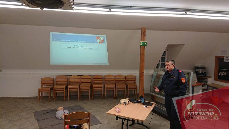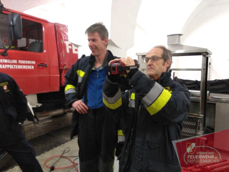 Im Block „Erste Hilfe“ wurde Reanimation (Prüfen – Rufen – Drücken), vorgetragen durch SBFMD FM Michael Nimpfer, wiederholt. Das Thema Wärmebildkamera handelten SBNRD OFM Manuel Poeselt und OFM Georg Berger ab. Zugskommandant OBM Johann Brabec trug den Lehrinhalt Fensteröffnung vor. Wo welches Einsatzgerät im TLF verstaut ist, wurde über Fahrmeister BM Christoph Poeselt und FM Stefan Reisinger vermittelt und im Anschluss abgeprüft.