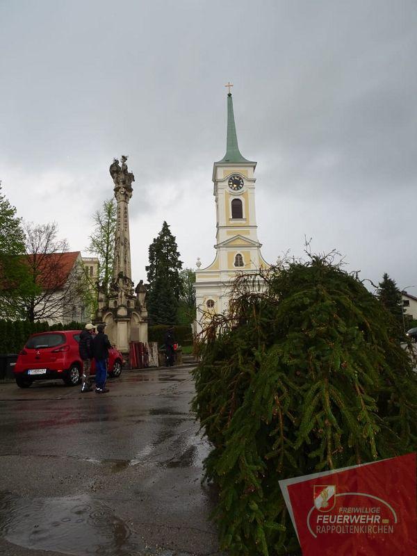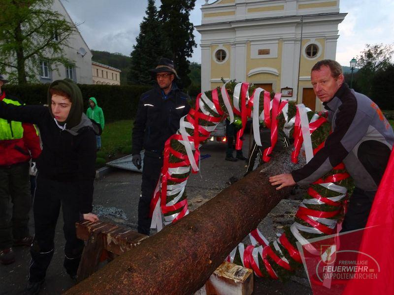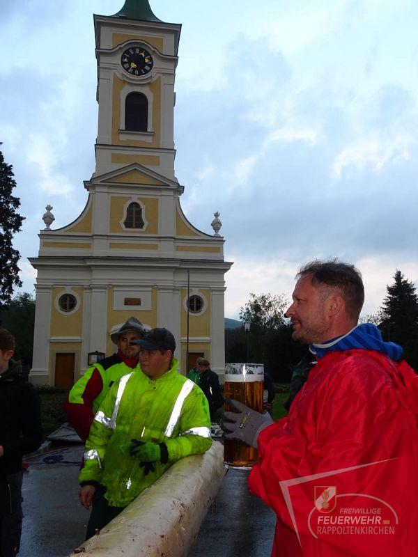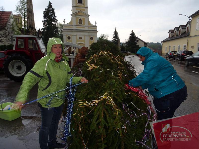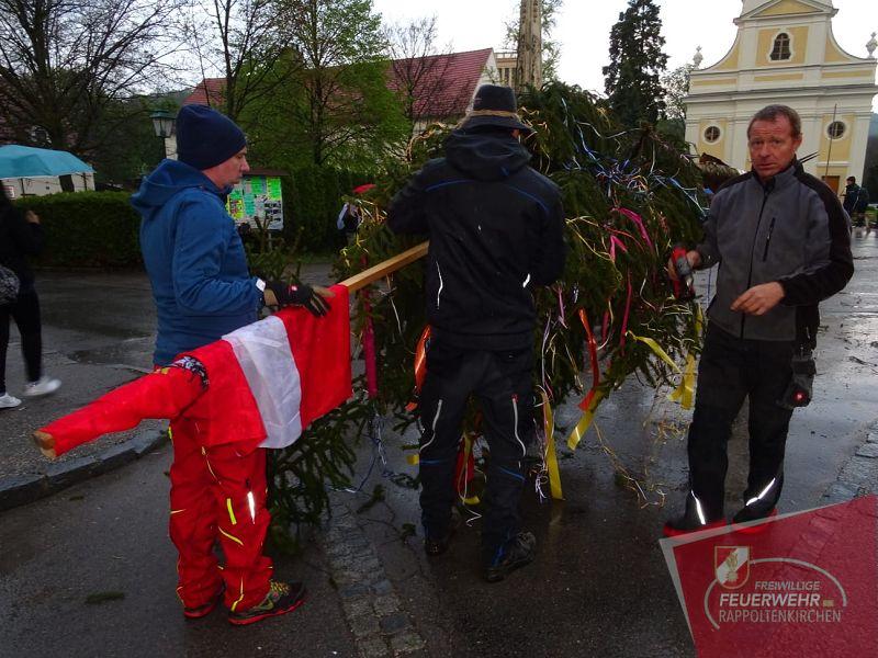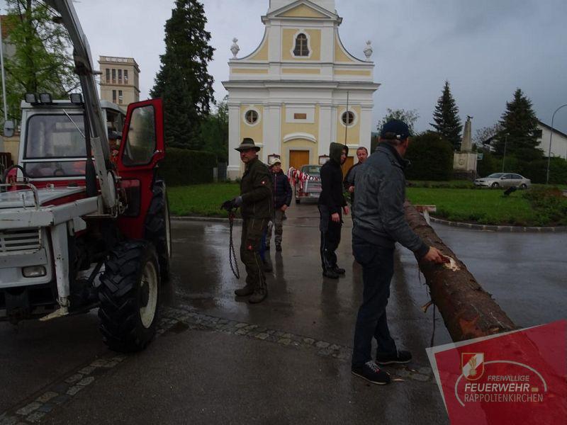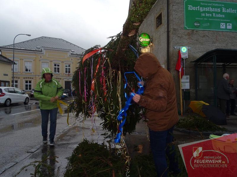 Leider spielte das April-Wetter nicht mit – trotz heftiger Regenfälle gelang es den Kameraden der FF Rappoltenkirchen, mit tatkräftiger Unterstützung des Vereines Rappoltenkirchen AKTIV, den Maibaum zu schmücken und aufzustellen.