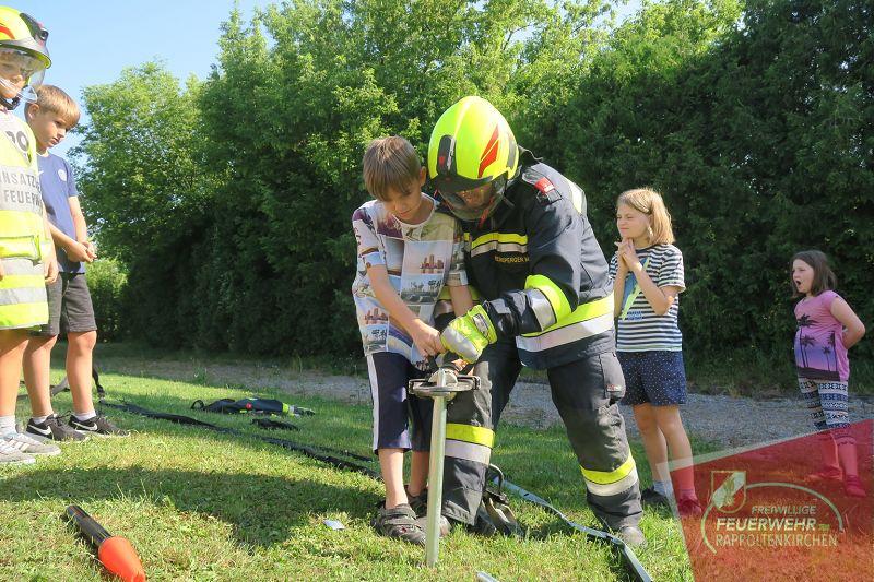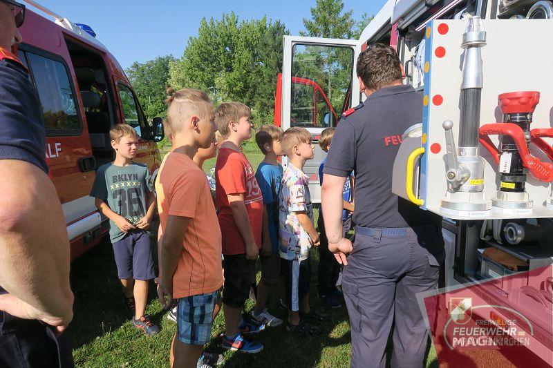 Der Theorieteil beinhaltete zum Beispiel wie man sich bei einem Brand richtig verhält oder einen Notruf richtig absetzt. Im Anschluss konnten dann die Fahrzeuge selbst erkundet werden und die Kinder hatten die Möglichkeit, ihre ersten eigenen Löschversuche durchzuführen.