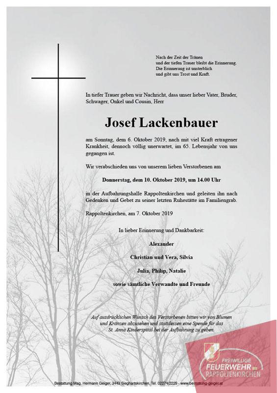 Wir trauern um unseren Feuerwehrkameraden Oberlöschmeister Josef Lackenbauer, der am 6. Oktober 2019, nach mit viel Kraft ertragener Krankheit, dennoch völlig unerwartet von uns gegangen ist.
