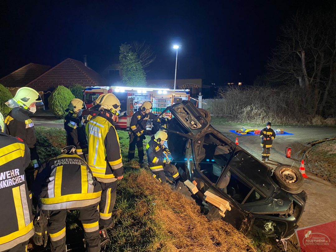 Nach der Ankunft erkundete Einsatzleiter Johannes Albrecht die Lage und erteilte erste Befehle. Nach der Absicherung und Ausleuchtung der Unfallstelle wurden die Unfallfahrzeuge aufwendig stabilisiert, um jegliche Bewegung im unwegsamen Gelände zu unterbinden. Danach konnte mit der Menschenrettung begonnen werden, welche rasch durchgeführt war. Nun galt es die Fahrzeuge zu bergen und die Unfallstelle zu reinigen (sämtliche Betriebsmittel wurden bereits vorher aus den Übungsfahrzeugen entfernt).