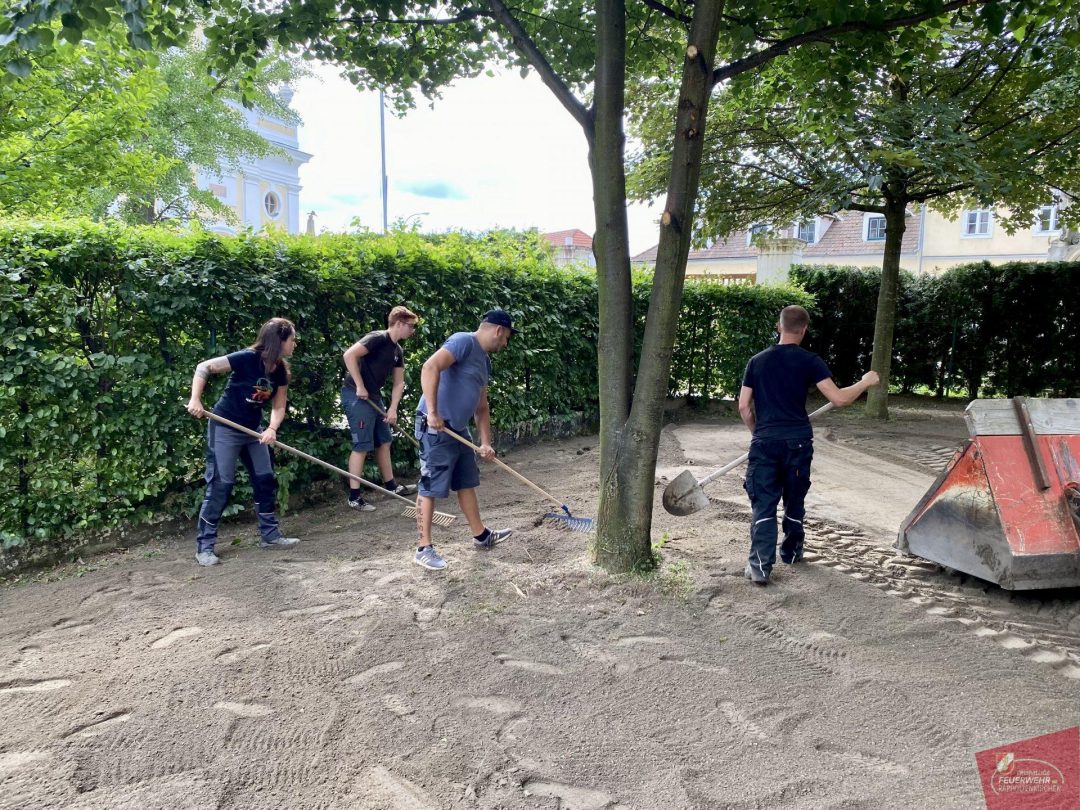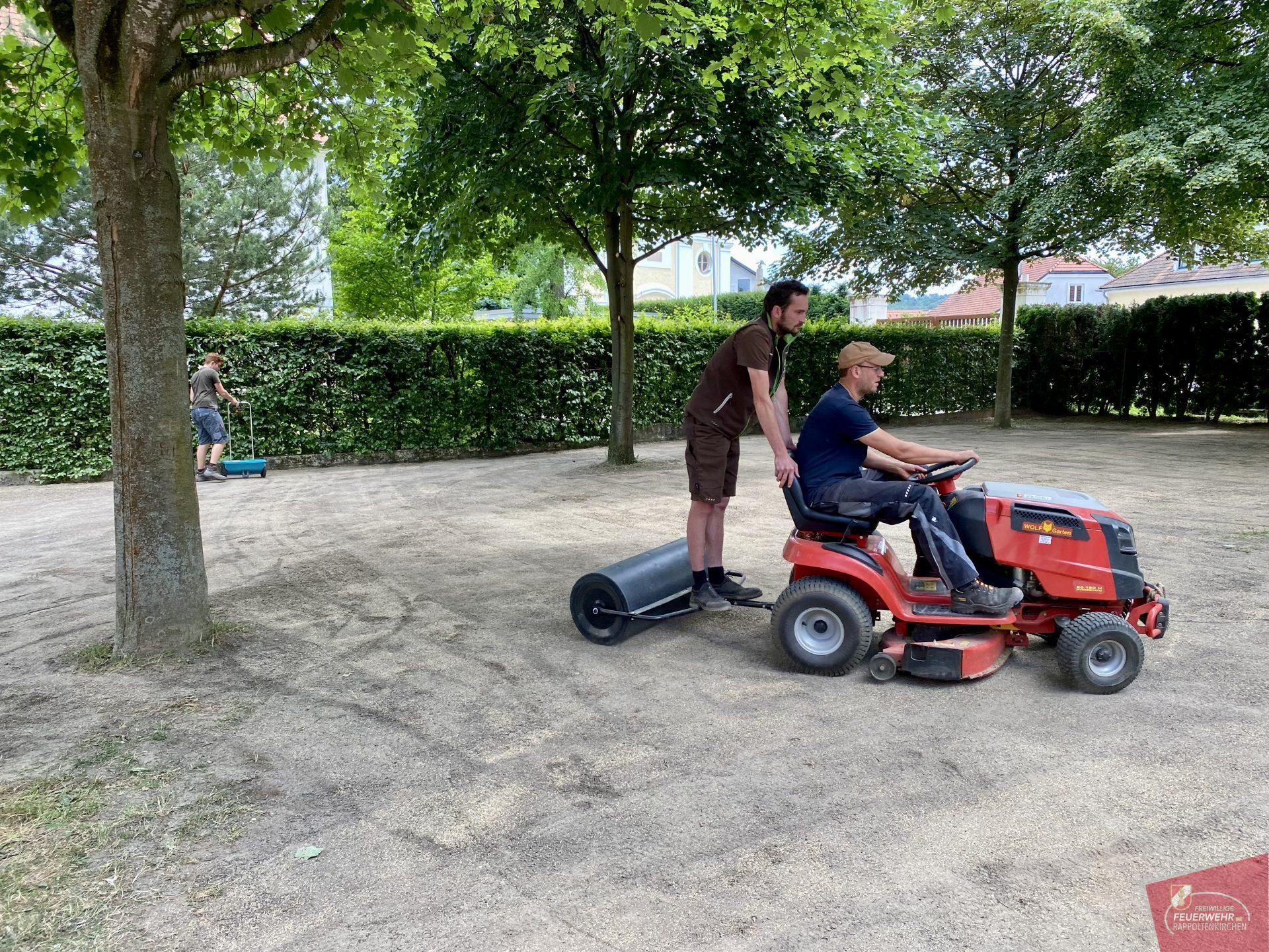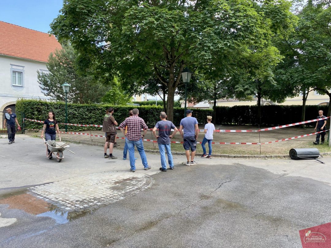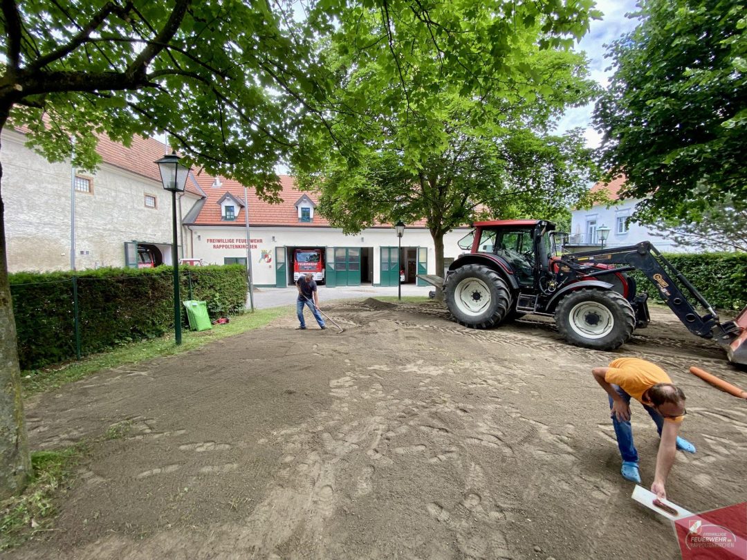 An diesem Samstag trafen sich einige Mitglieder unserer Feuerwehr, um den über die Jahre ramponierten Rasen neu anzulegen. Nach einem ordentlichen Frühstück wurde die Oberfläche aufgefräst, grob abgezogen und im Anschluß mit bester Rasenerde der Firma Wienerwald Kompost aufgefüllt. Diese stellte ebenfalls Geräte zur Bearbeitung zur Verfügung. Dafür bedanken wir uns recht herzlich!