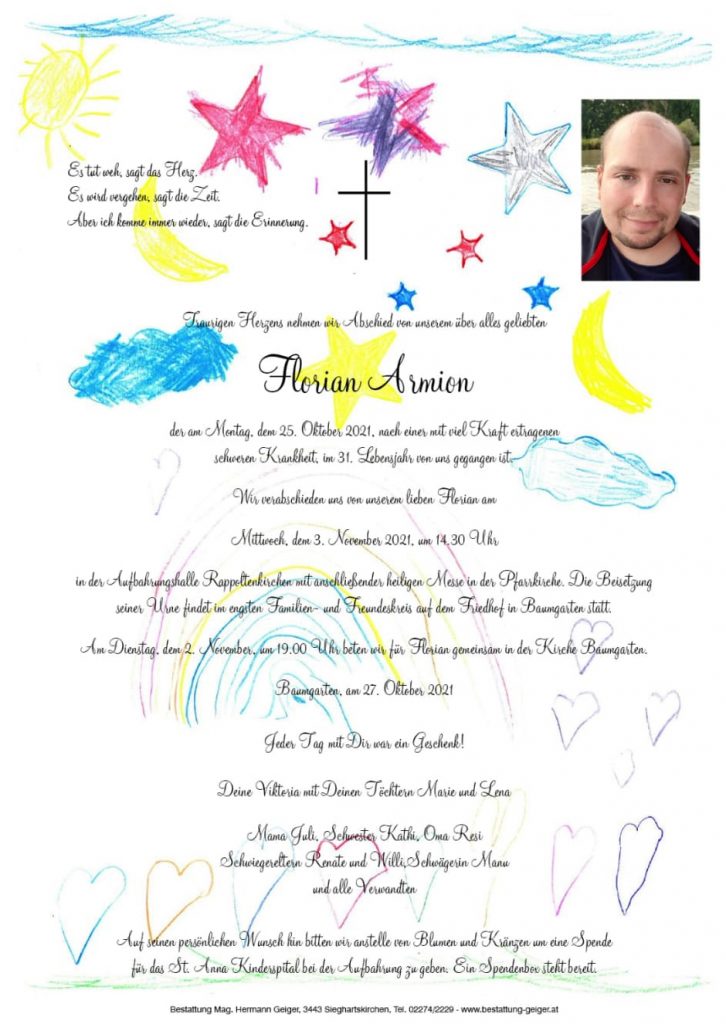 Die Freiwillige Feuerwehr Rappoltenkirchen gibt in tiefer Trauer bekannt, dass unser Feuerwehrkamerad Florian Armion am 25. Oktober 2021 im 31. Lebensjahr verstorben ist.