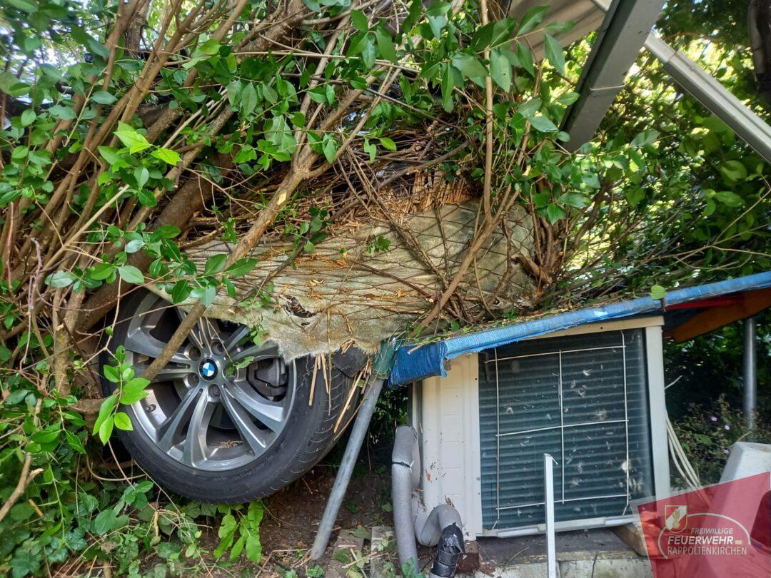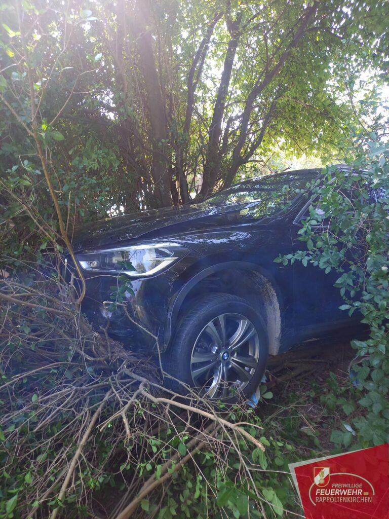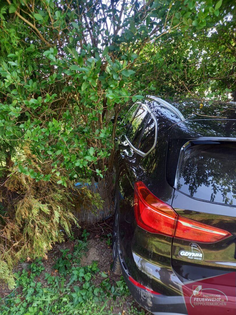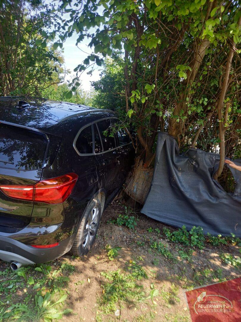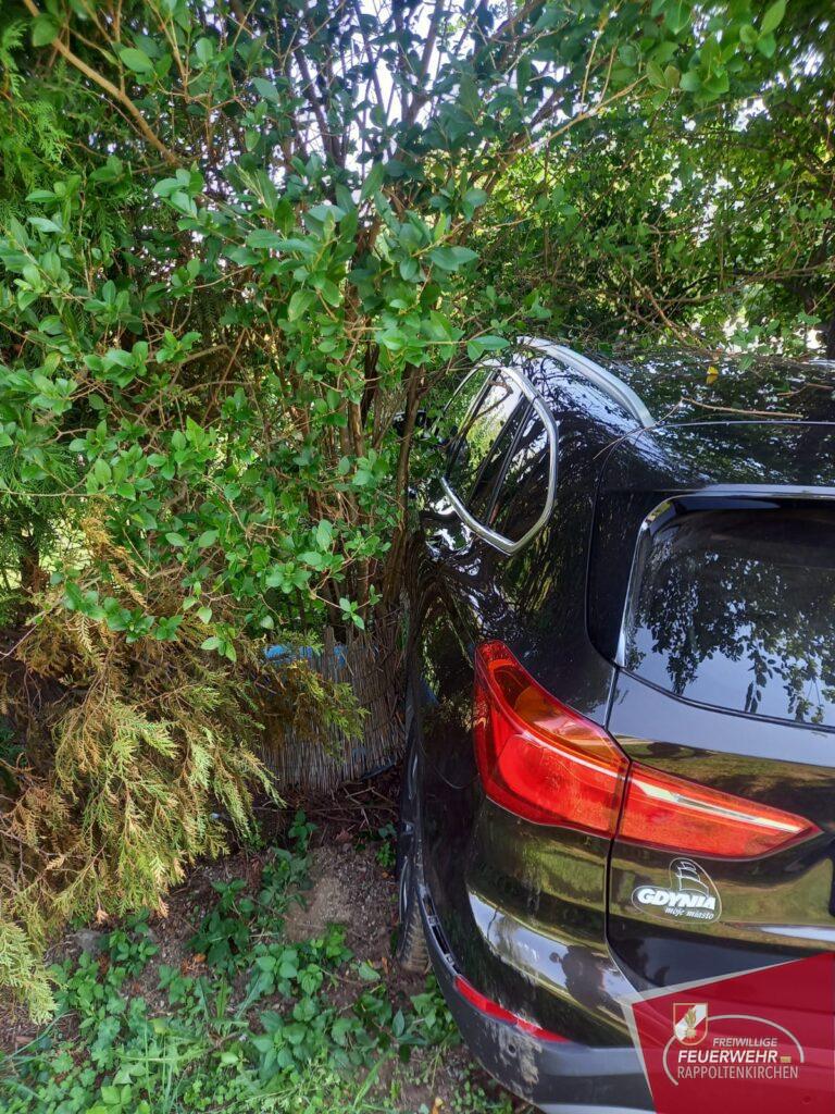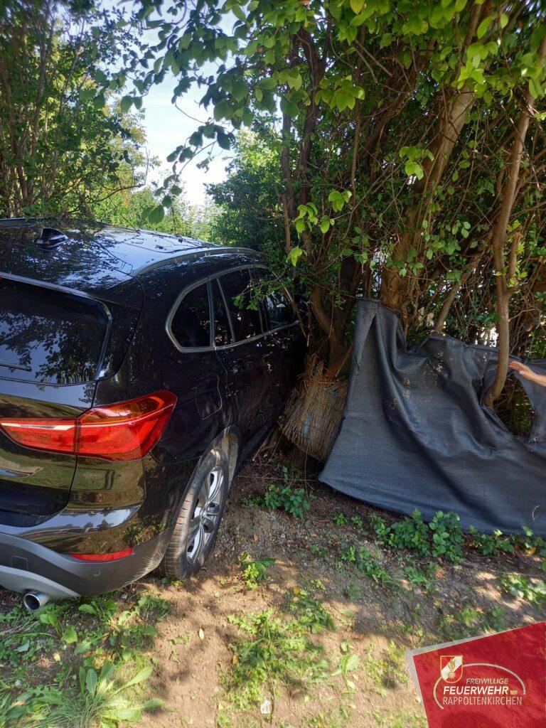 Gegen 12 Uhr wollte die Lenkerin eines BMW am Parkplatz des Campingplatzes in Rappoltenkirchen rückwärts ausparken. Dabei touchierte sie mit einem Masten. Unverzüglich legte sie den Vorwärtsgang ein und dürfte aufgrund des Schocks das Gas- und Bremspedal verwechselt haben. In der Folge fuhr sie durch eine Hecke und landete mit dem Frontbereich des BMWs auf dem Lüfter einer Klimaanlage. Seitens der Feuerwehr Rappoltenkirchen wurde die Hecke im Nahbereich des PKWs entfernt, um diesen schonend mittels Seilwinde bergen zu können. Der beschädigte PKW wurde am Parkplatz abgestellt. Nach rund 1 Stunde wurde der Einsatz beendet.