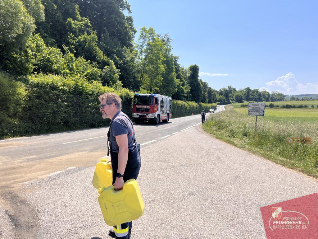 Kurz nach 11 Uhr ereignete sich im Kreuzungsbereich L123 / Portierstraße ein Verkehrsunfall. Während des Abbiegevorganges touchierte die Lenkerin eines Opels das Brückengeländer bzw. die Portsteinkante. Aufgrund der Kollision wurde die Ölwanne schwer beschädigt, sodass es zu einem Ölaustritt kam. Die Feuerwehren Rappoltenkirchen und Sieghartskirchen reinigten die verschmutzte Fahrbahn mit Ölbindemitteln. Während des Einsatzes wurde der Verkehr wechselweise angehalten. Im Einsatz standen ebenfalls die Polizei Sieghartskirchen, sowie die Straßenmeisterei Atzenbrugg.