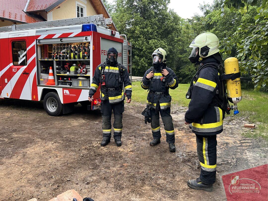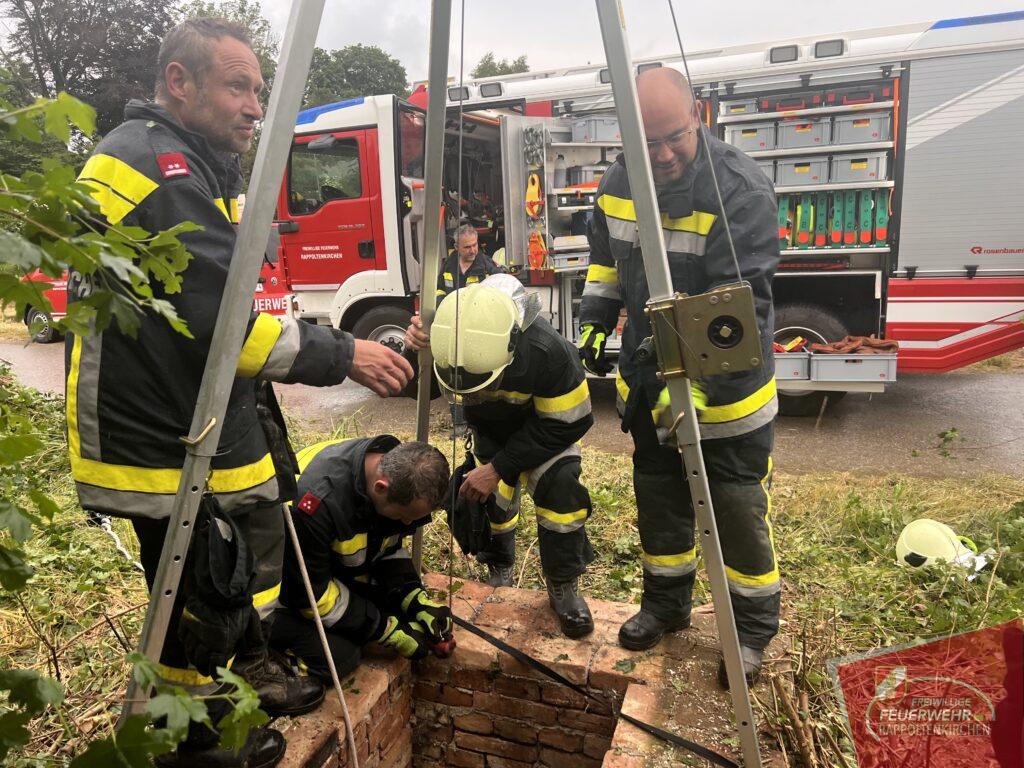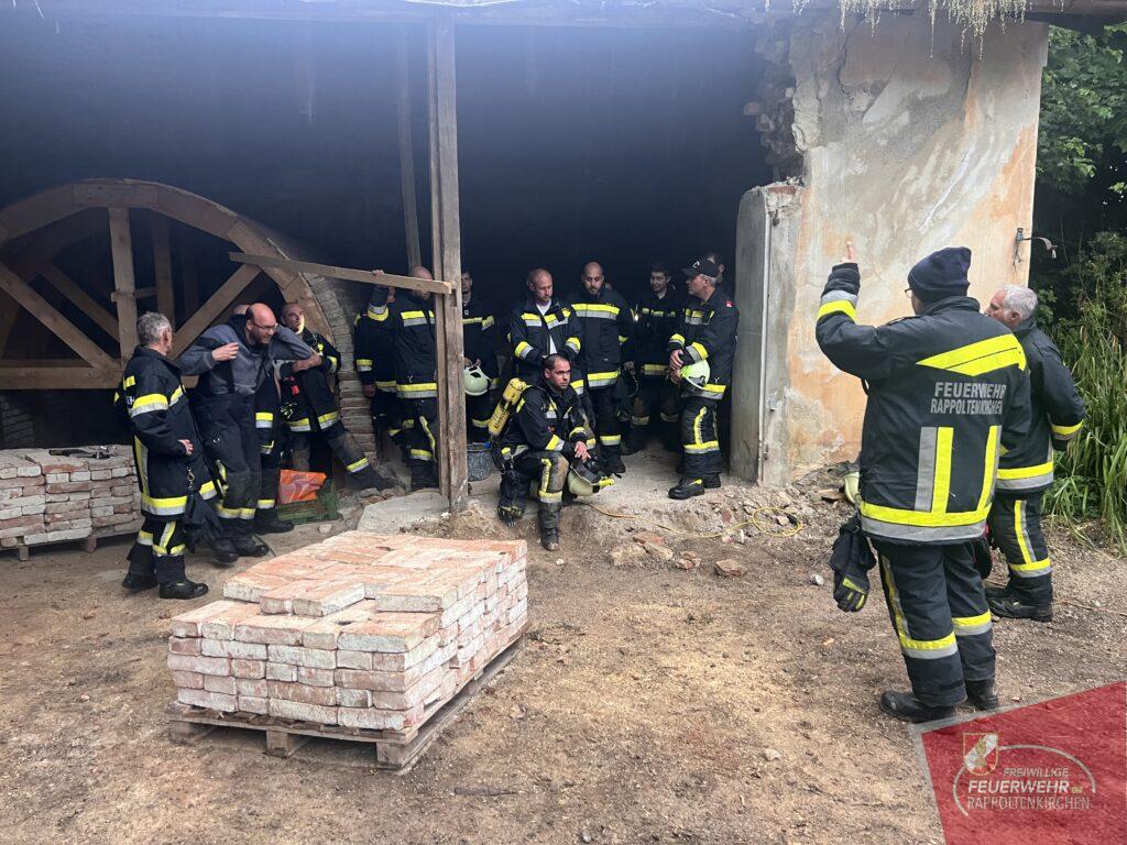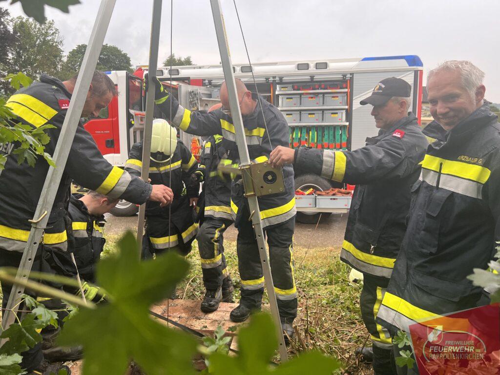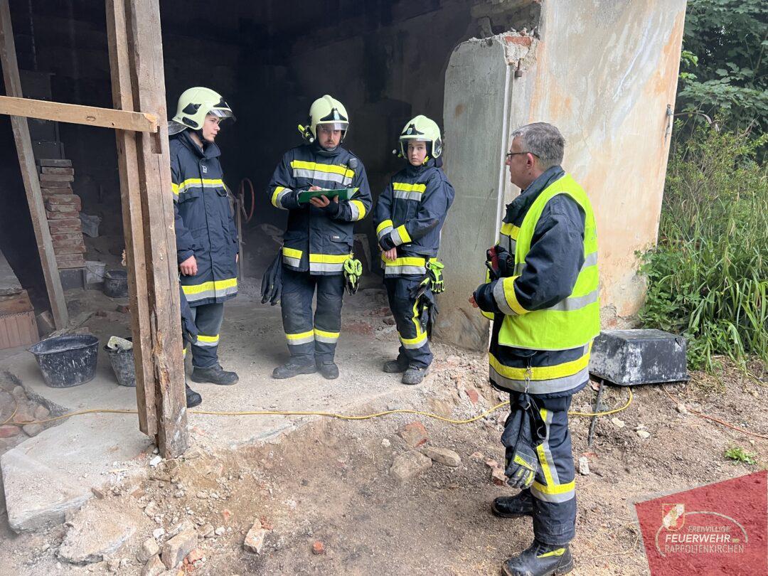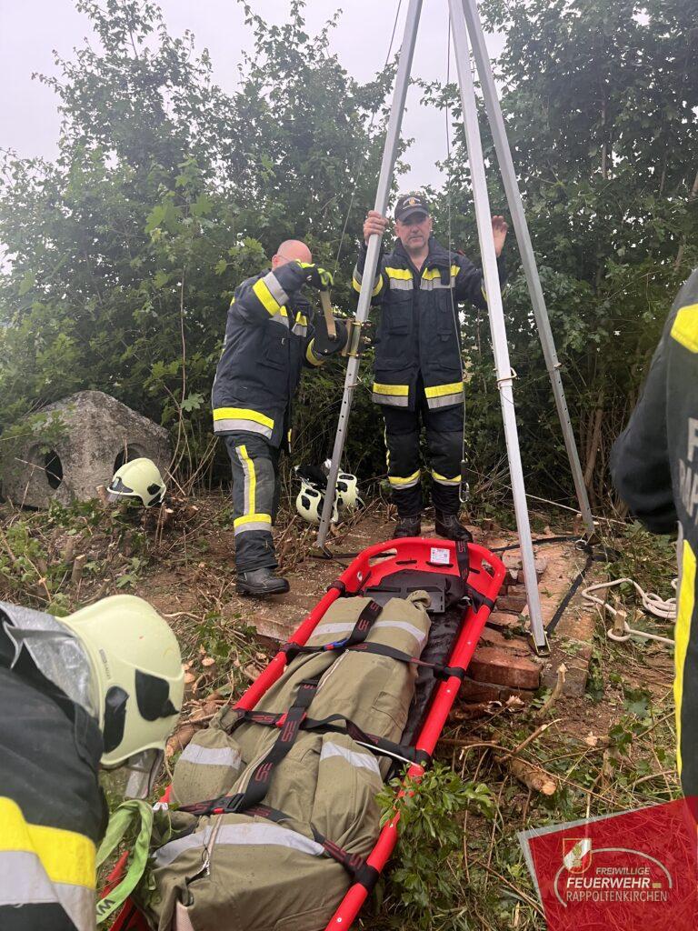 Die diesjährige Gesamtübung der FF Rappoltenkirchen wurde am Anwesen von Familie Deckardt abgehalten. Als Übungsobjekt diente ein rund 30 Meter langer Erdkeller. In diesem wurde aufgrund von Kohlendioxidaustritt eine Person vermisst. Unverzüglich rüstete sich der 1. Atemschutztrupp aus und begann mit der Suche nach dem Vermissten. Zeitgleich wurde auf der anderen Seite im Außenbereich des Erdkellers ein Rettungsschacht entdeckt. Dieser war jedoch mit Stauden verwachsen, sodass diese entfernt werden mussten, um zum Schacht zu gelangen. Unmittelbar danach wurde das Dreibein aufgestellt und die Korbschleiftrage wurde durch den rund 7 Meter tiefen Schacht zum Verunfallten abgeseilt. Zeitgleich ist der 2. Atemschutztrupp zum Verletzten vorgedrungen. Unverzüglich wurde mit der Menschenrettung begonnen. Der Verletzte wurde auf die Korbschleiftrage umgelegt und mittels Seilwinde hochgezogen. Bei dieser höchst interessanten Übung, welche von Georg Kurzbauer und Michael Nimpfer bestens ausgearbeitet wurde, lag das Hauptaugenmerk im Bereich des Atemschutzes, des Funkverhaltens, sowie der Einsatz vom Dreibein und Korbschleiftrage. Bei der Übungsnachbesprechung bedankte sich Kommandant Robert Lackenbauer bei Familie Deckardt für die Bereitstellung des Übungsobjekts, bei Georg Kurzbauer und Michael Nimpfer für die sehr gut ausgearbeitete Übung, sowie bei den vielen anwesenden Feuerwehrkameraden. Zum Abschluss versorgte Georg Kurzbauer die Mannschaft mit Grillwürstel. Dafür vielen Dank!
