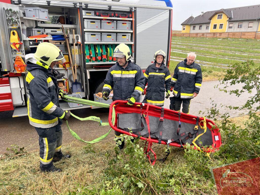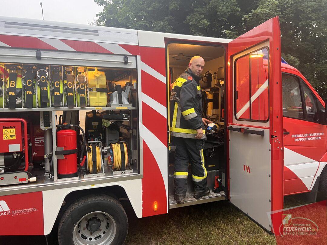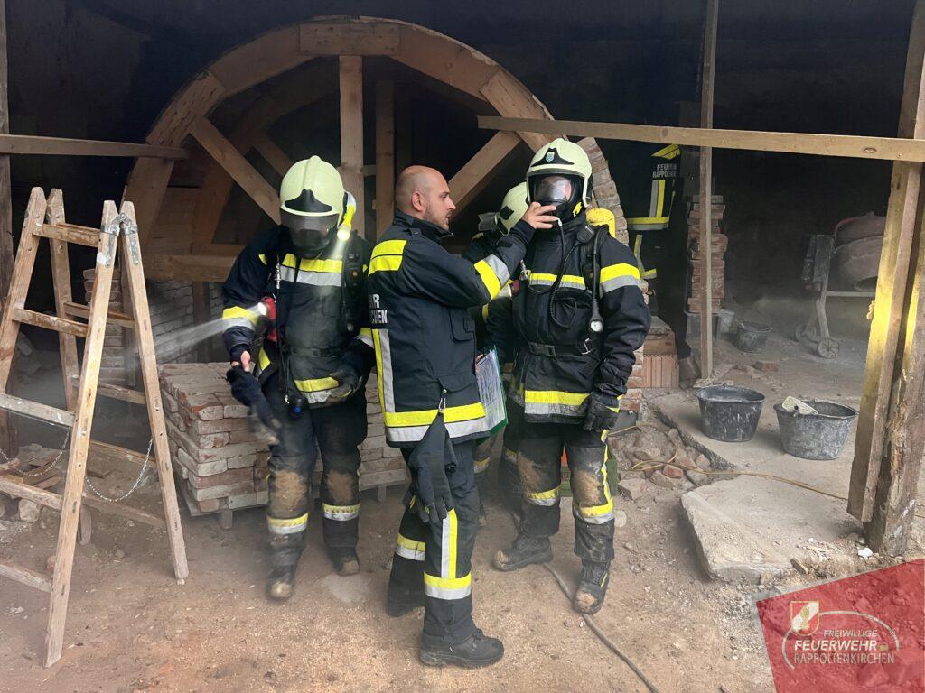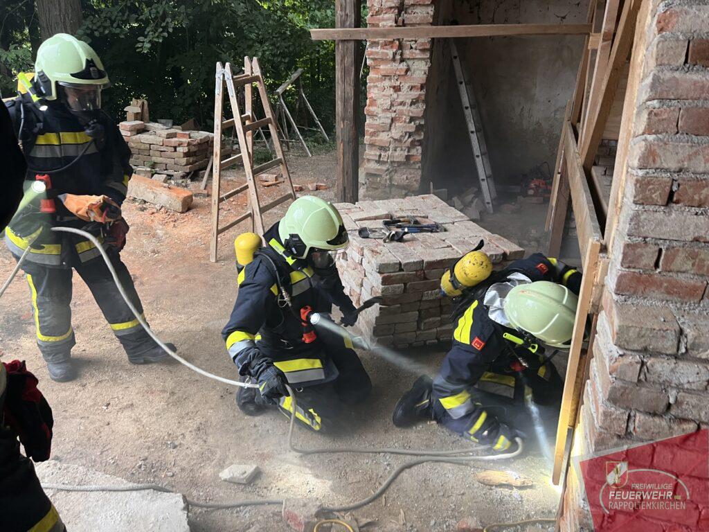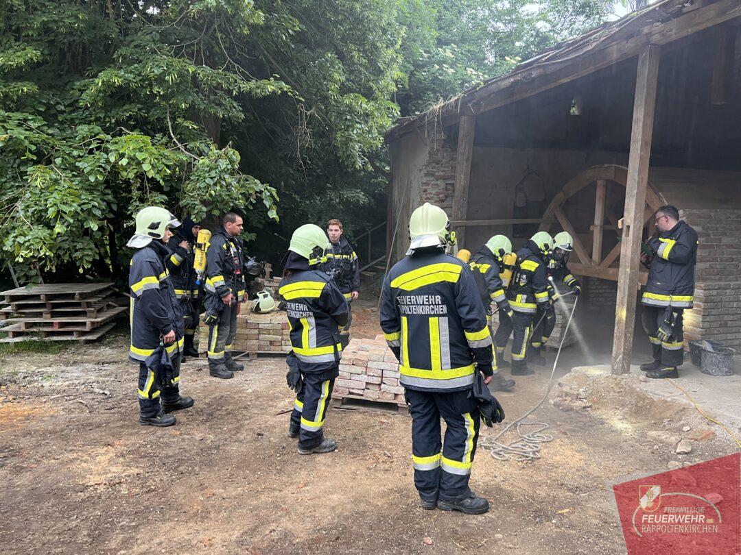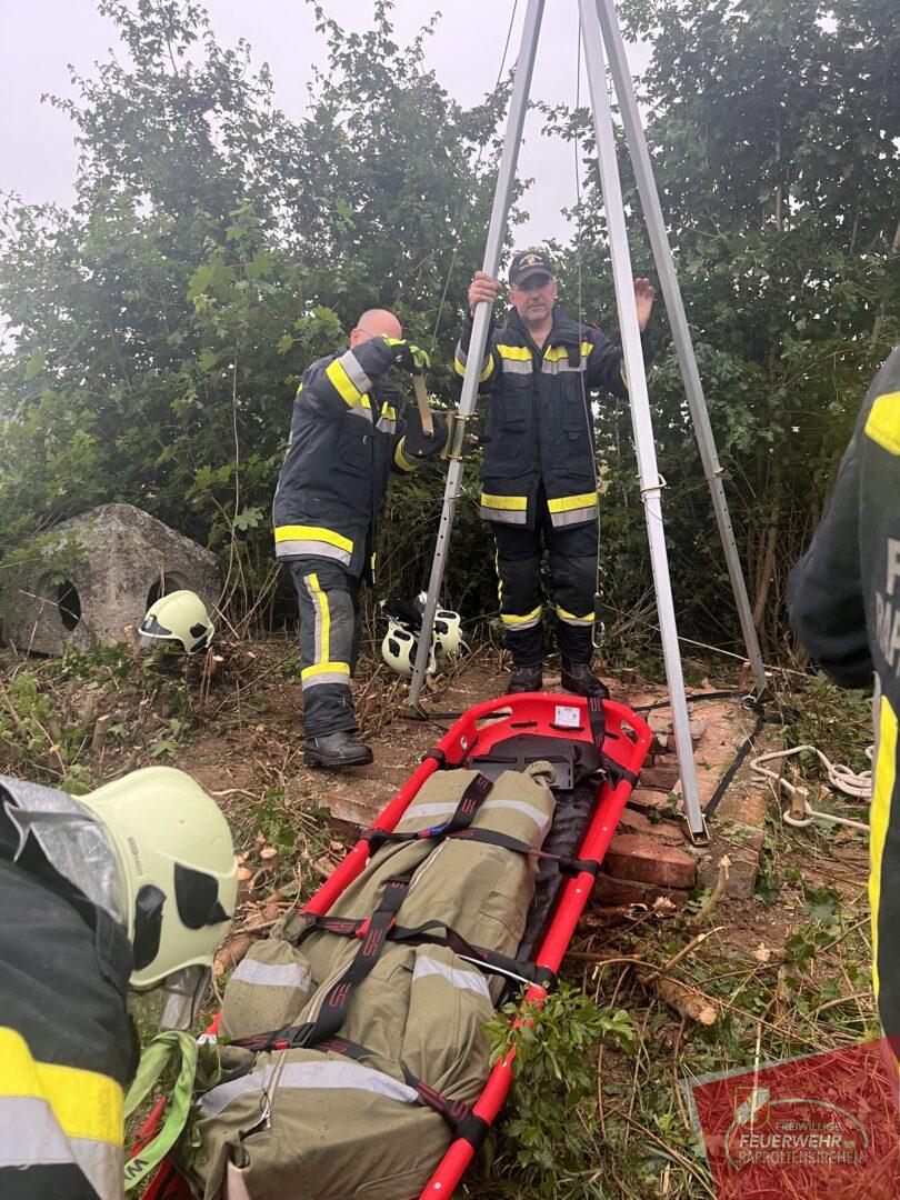 Die diesjährige Gesamtübung der FF Rappoltenkirchen wurde am Anwesen von Familie Deckardt abgehalten. Als Übungsobjekt diente ein rund 30 Meter langer Erdkeller. In diesem wurde aufgrund von Kohlendioxidaustritt eine Person vermisst. Unverzüglich rüstete sich der 1. Atemschutztrupp aus und begann mit der Suche nach dem Vermissten. Zeitgleich wurde auf der anderen Seite im Außenbereich des Erdkellers ein Rettungsschacht entdeckt. Dieser war jedoch mit Stauden verwachsen, sodass diese entfernt werden mussten, um zum Schacht zu gelangen. Unmittelbar danach wurde das Dreibein aufgestellt und die Korbschleiftrage wurde durch den rund 7 Meter tiefen Schacht zum Verunfallten abgeseilt. Zeitgleich ist der 2. Atemschutztrupp zum Verletzten vorgedrungen. Unverzüglich wurde mit der Menschenrettung begonnen. Der Verletzte wurde auf die Korbschleiftrage umgelegt und mittels Seilwinde hochgezogen. Bei dieser höchst interessanten Übung, welche von Georg Kurzbauer und Michael Nimpfer bestens ausgearbeitet wurde, lag das Hauptaugenmerk im Bereich des Atemschutzes, des Funkverhaltens, sowie der Einsatz vom Dreibein und Korbschleiftrage. Bei der Übungsnachbesprechung bedankte sich Kommandant Robert Lackenbauer bei Familie Deckardt für die Bereitstellung des Übungsobjekts, bei Georg Kurzbauer und Michael Nimpfer für die sehr gut ausgearbeitete Übung, sowie bei den vielen anwesenden Feuerwehrkameraden. Zum Abschluss versorgte Georg Kurzbauer die Mannschaft mit Grillwürstel. Dafür vielen Dank!