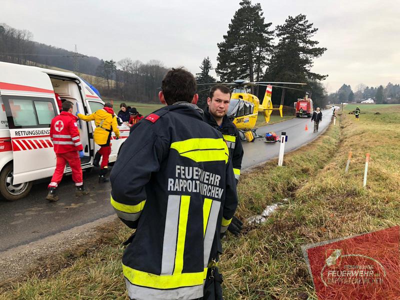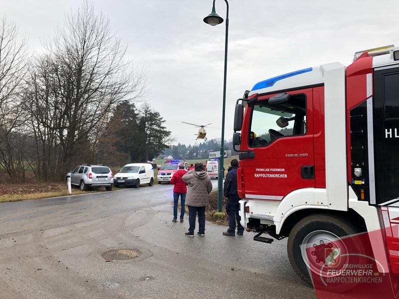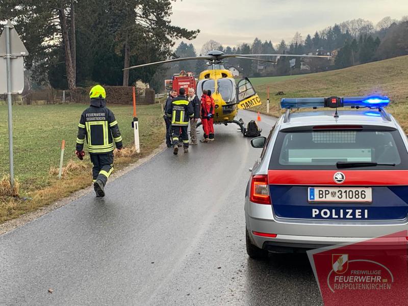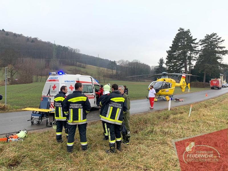 Ein Ehepaar war am Waldrand mit Baumfällarbeiten beschäftigt, als plötzlich ein Baum während der Schlägerung in 3m Höhe abriss und den Mann mit voller Wucht traf. Seine Frau konnte ihn teilweise unter dem Baum befreien, leistete Erste Hilfe und alarmierte die Rettungskräfte.