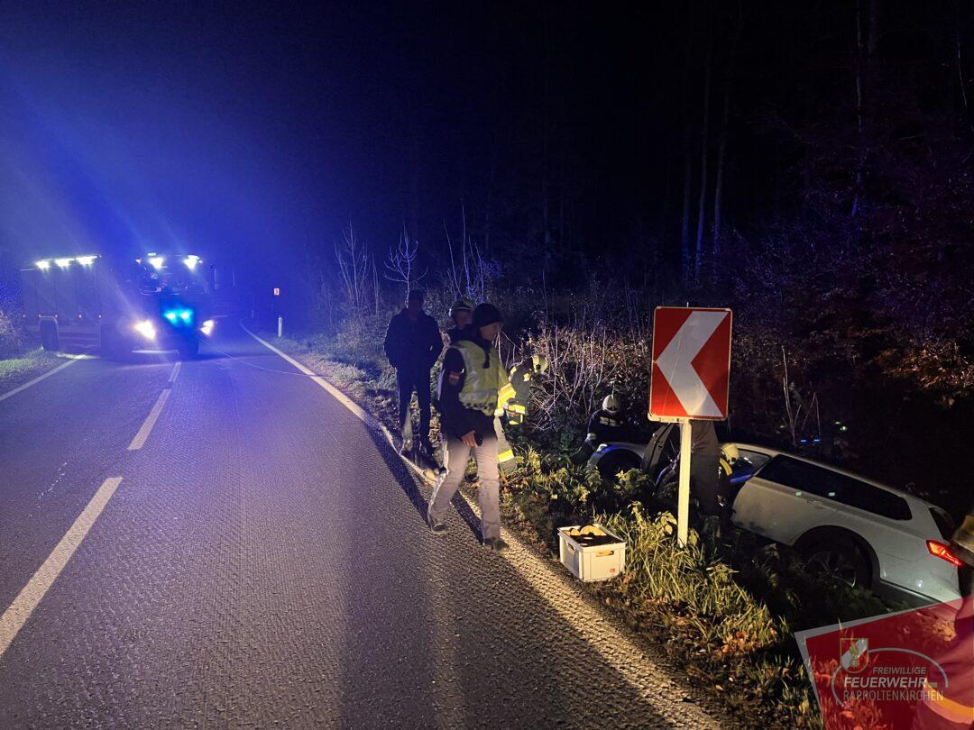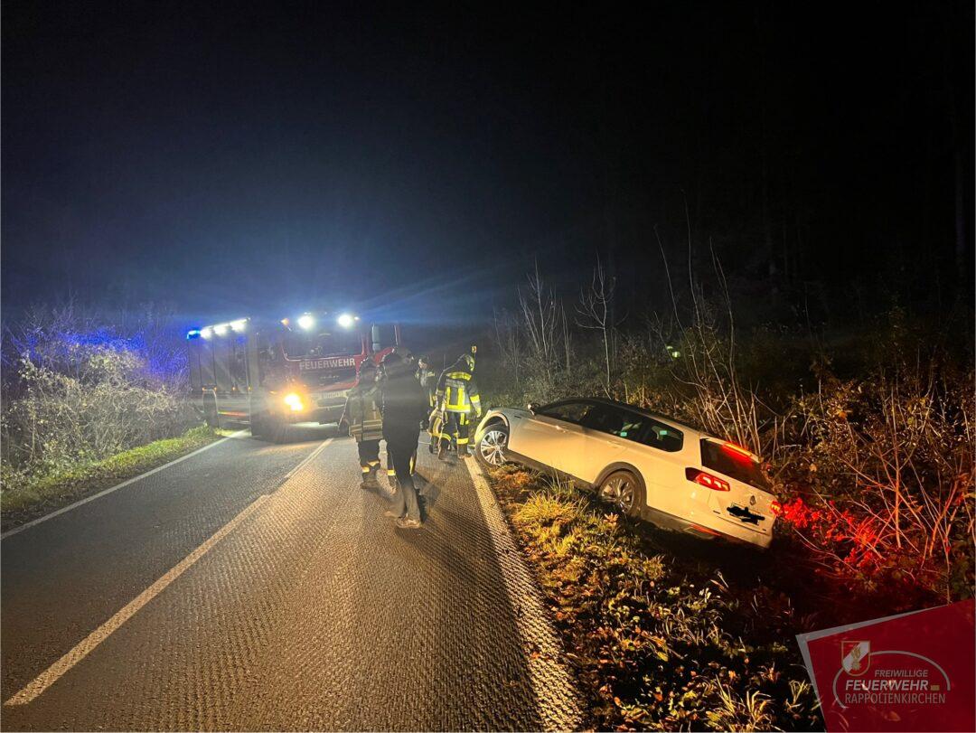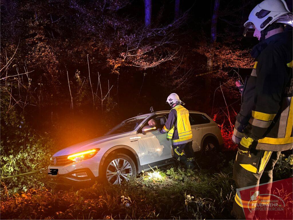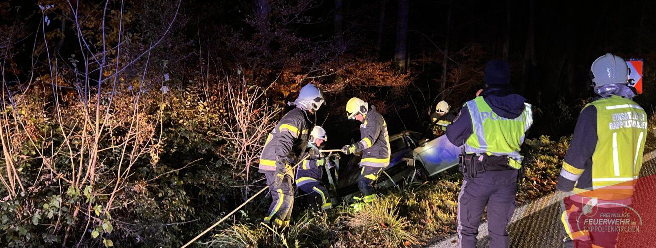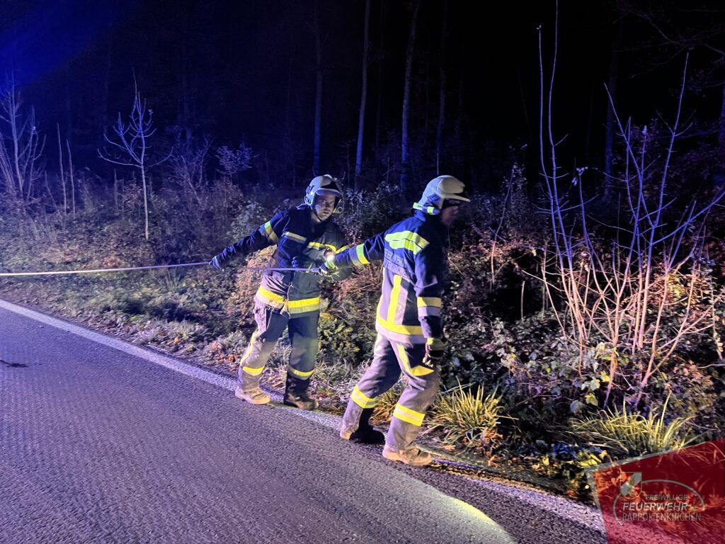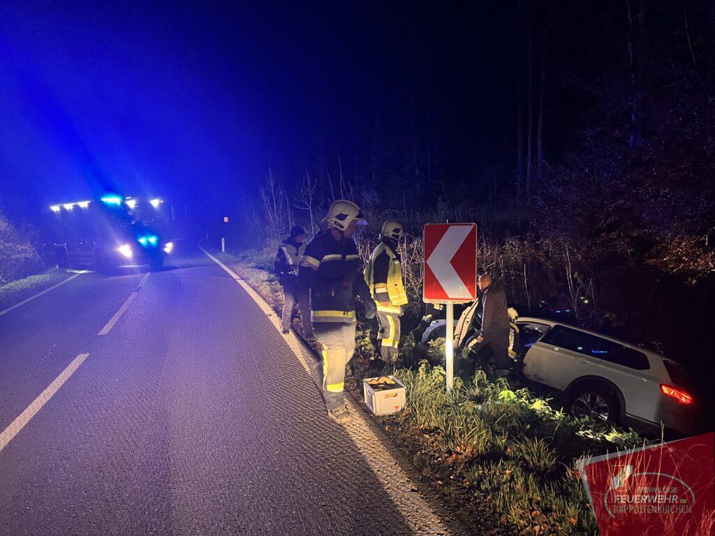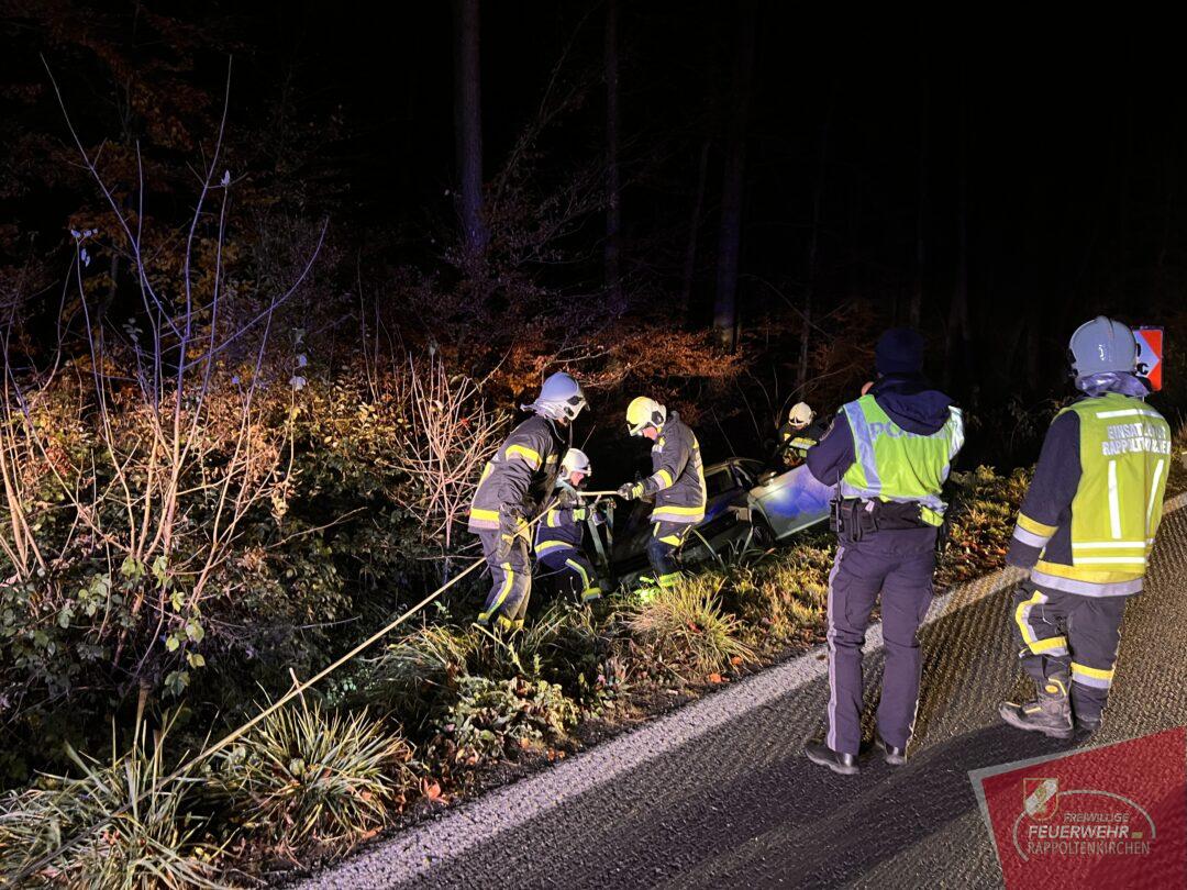 In den Abendstunden des 21. Novembers ereignete sich ein Verkehrsunfall auf der Landesstraße 123 zwischen Rappoltenkirchen und dem Ortsteil Tirolersiedlung. In einer starken Linkskurve kam der Lenker eines PKWs von der Fahrbahn ab und schlitterte in den dort befindlichen Straßengraben. Dieser konnte das Fahrzeug selbstständig und unverletzt verlassen. Die ausrückende Mannschaft des HLF 2 konnte mit der Seilwinde den PKW schonend an dem Graben ziehen. In der Folge wurde das Fahrzeug auf einem Parkplatz abgestellt. Während der Bergungsarbeiten wurde der Verkehr kurzfristig angehalten. Ebenso im Einsatz standen die PI Sieghartskirchen und der Samariterbund. Wir bedanken uns für die gute Zusammenarbeit.