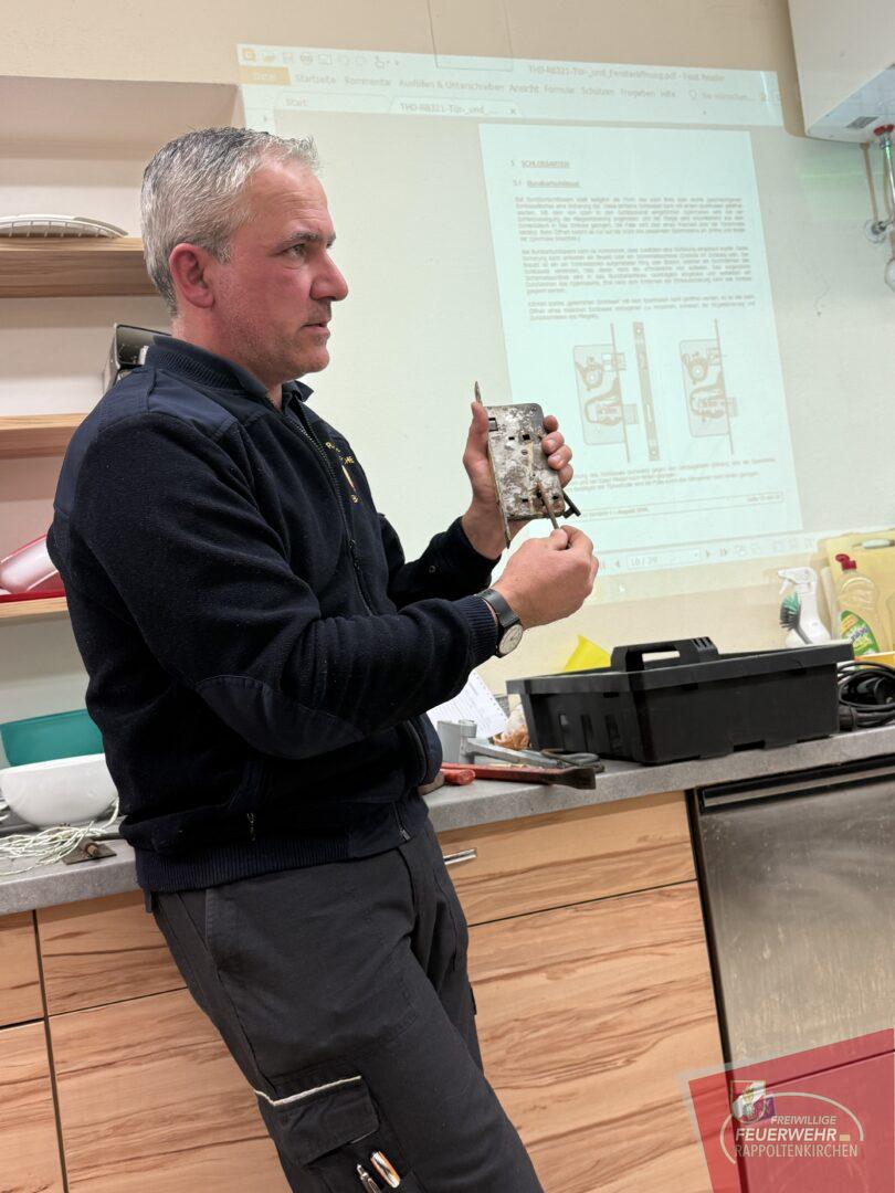Zu Beginn erläuterte er verschiedene Methoden, mit denen sich die Feuerwehr in Notfallsituationen schnell und schonend Zugang zu Wohnungen oder Gebäuden verschaffen kann. Dabei wurden sowohl einfache, als auch fortgeschrittene Techniken vorgestellt, die in unterschiedlichen Einsatzszenarien angewendet werden können.