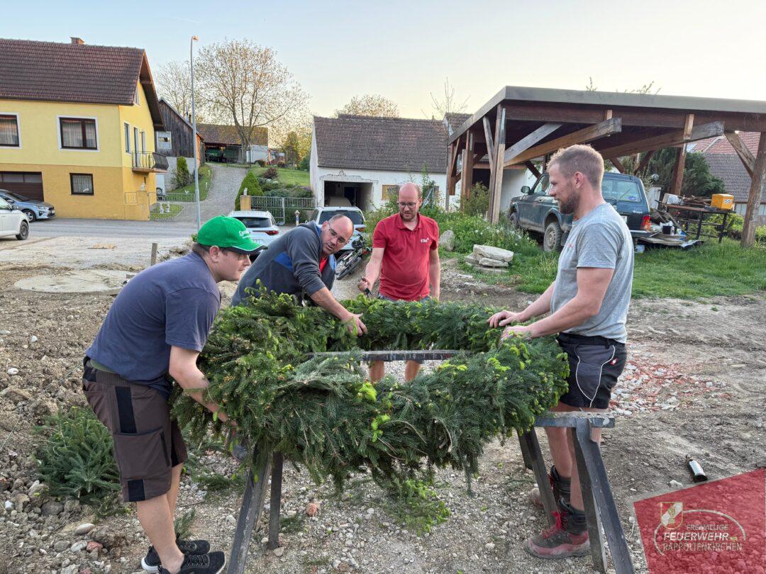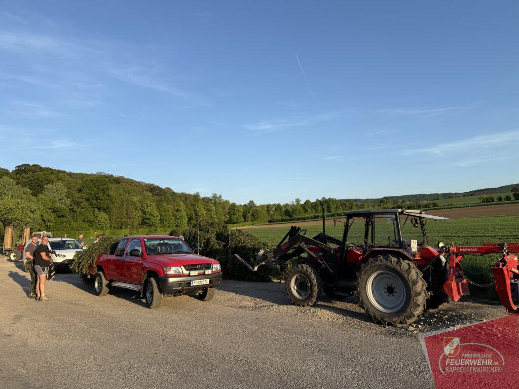 Bereits am Tag davor wurde mit den Vorbereitungen begonnen: Mitglieder der Feuerwehr sowie freiwillige Helferinnen und Helfer aus dem Ort banden in bewährter Weise einen Reisig-Kranz, der den Maibaum zieren soll. Am 30. April wurde dann der rund 28 Meter hohe Baum im Wald geschnitten und anschließend wurde der Baum mit vereinten Kräften unter Einsatz eines Radladers aufgestellt.