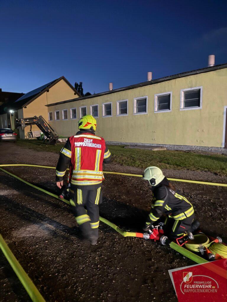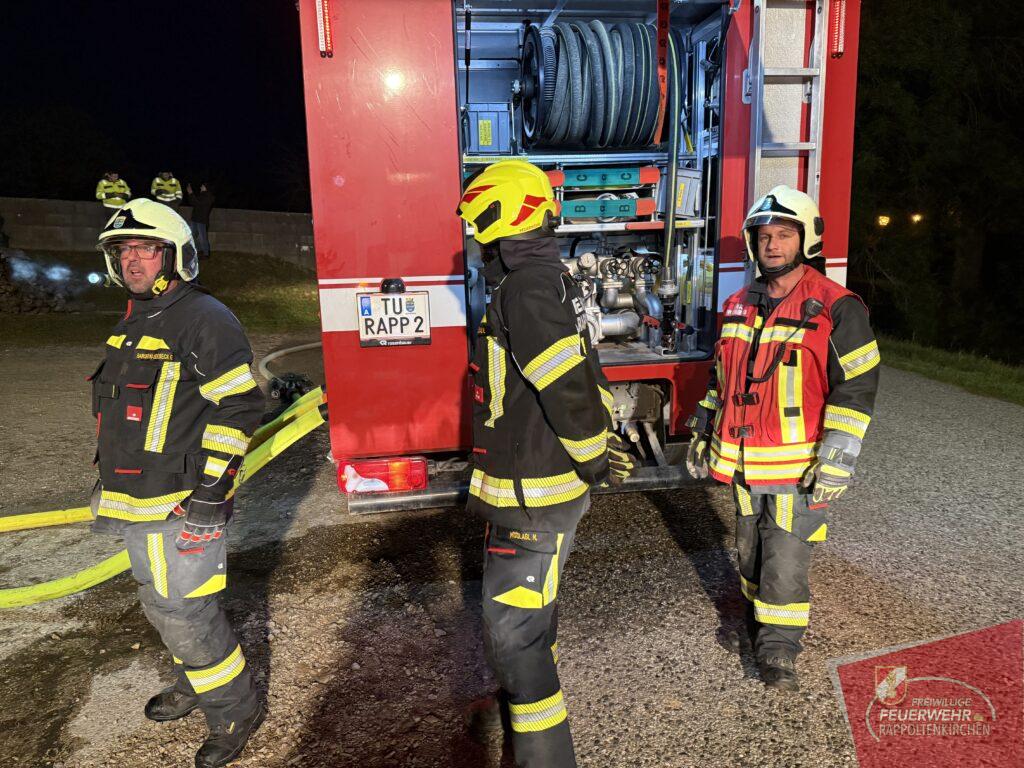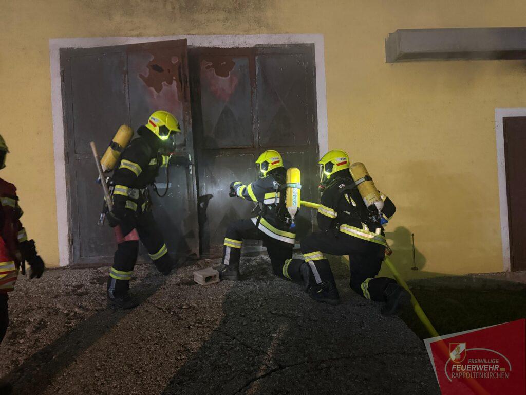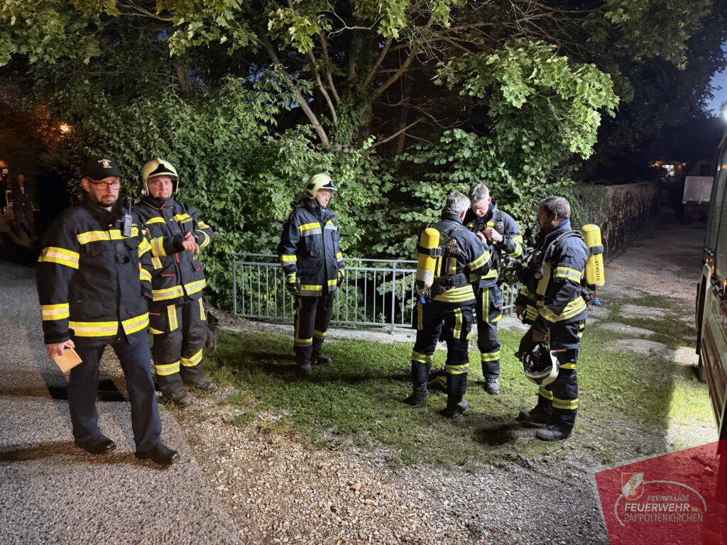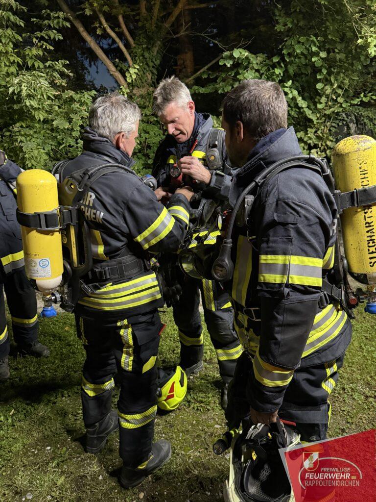 Unter schwerem Atemschutz drang ein Angriffstrupp in das Gebäude ein, um die Person zu lokalisieren und ins Freie zu bringen. Zeitgleich wurde eine Wasserversorgung vom nahegelegenen Bach mittels Tragkraftspritze aufgebaut, um den Löschangriff sicherzustellen. Die FF Rappoltenkirchen errichtete zusätzlich eine Versorgungsleitung vom Hydranten zum Tanklöschfahrzeug und unterstützte ebenfalls mit einem Außenangriffstrupp.