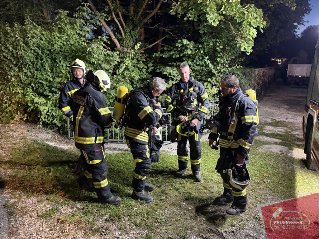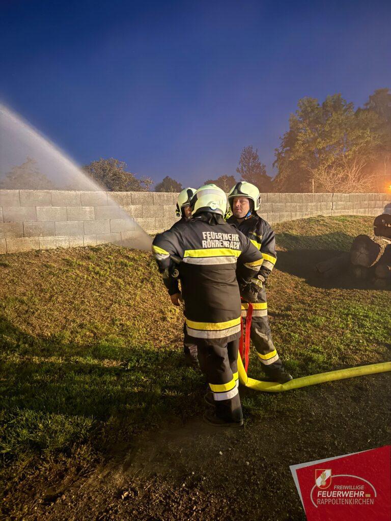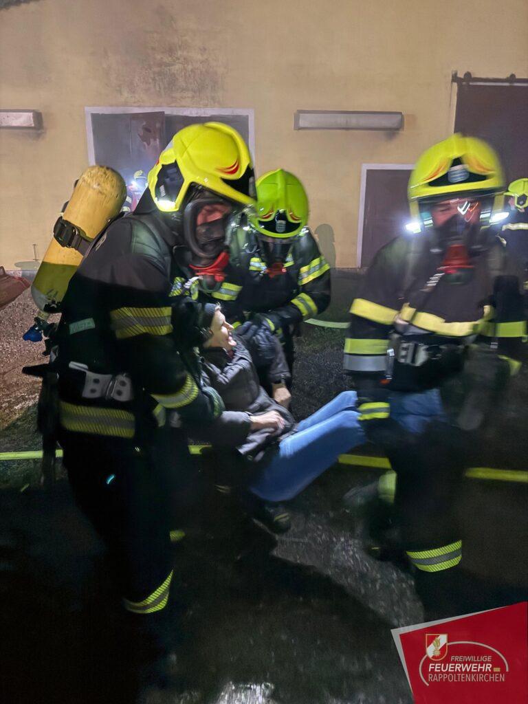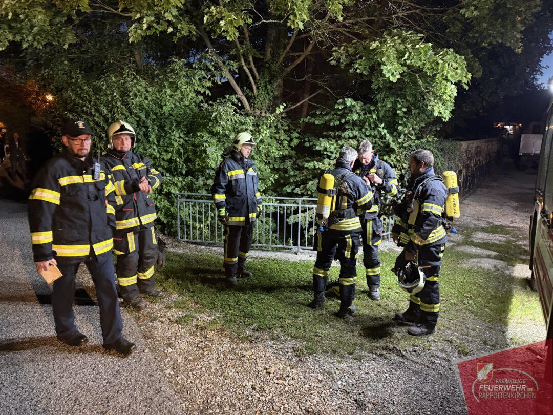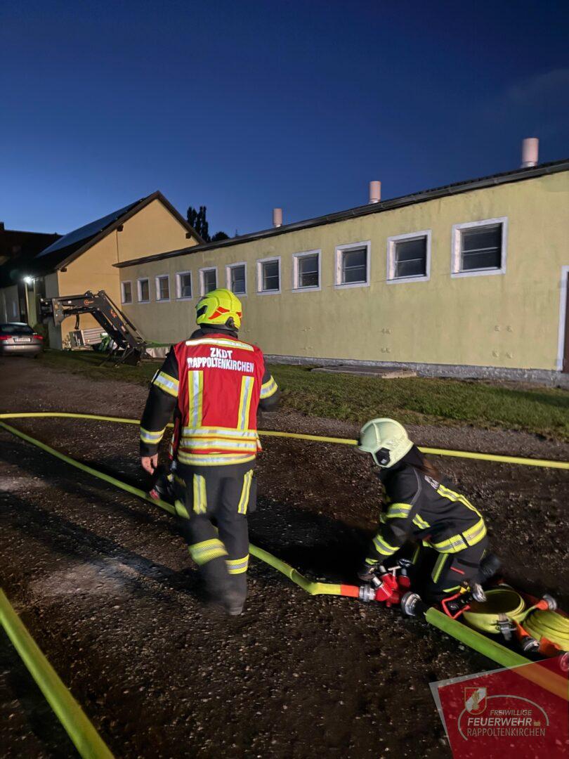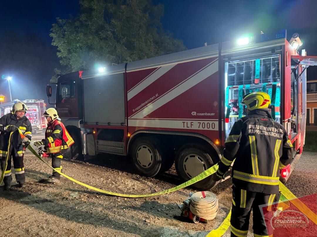 Unter schwerem Atemschutz drang ein Angriffstrupp in das Gebäude ein, um die Person zu lokalisieren und ins Freie zu bringen. Zeitgleich wurde eine Wasserversorgung vom nahegelegenen Bach mittels Tragkraftspritze aufgebaut, um den Löschangriff sicherzustellen. Die FF Rappoltenkirchen errichtete zusätzlich eine Versorgungsleitung vom Hydranten zum Tanklöschfahrzeug und unterstützte ebenfalls mit einem Außenangriffstrupp.
