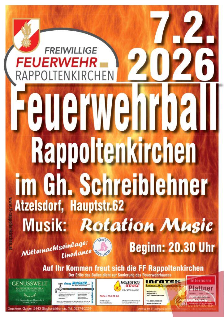 Am 7. Februar ist es wieder so weit: Die Freiwillige Feuerwehr Rappoltenkirchen lädt sehr herzlich zum traditionellen Feuerwehrball ein. Gefeiert wird im Gasthaus Schreiblehner in Atzelsdorf, wo wir unsere Gäste in festlicher Atmosphäre willkommen heißen dürfen.