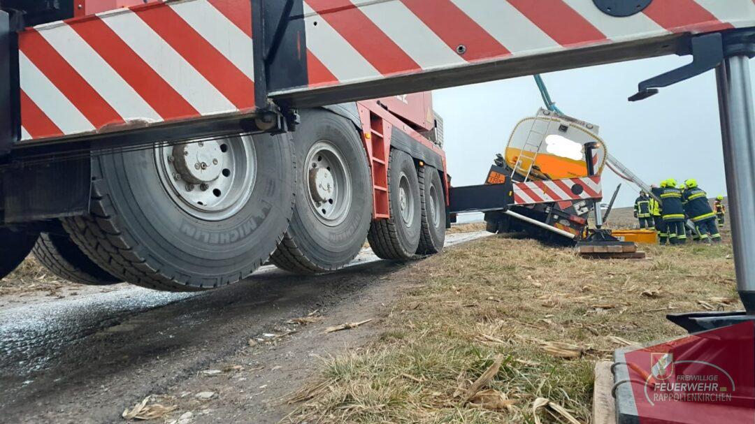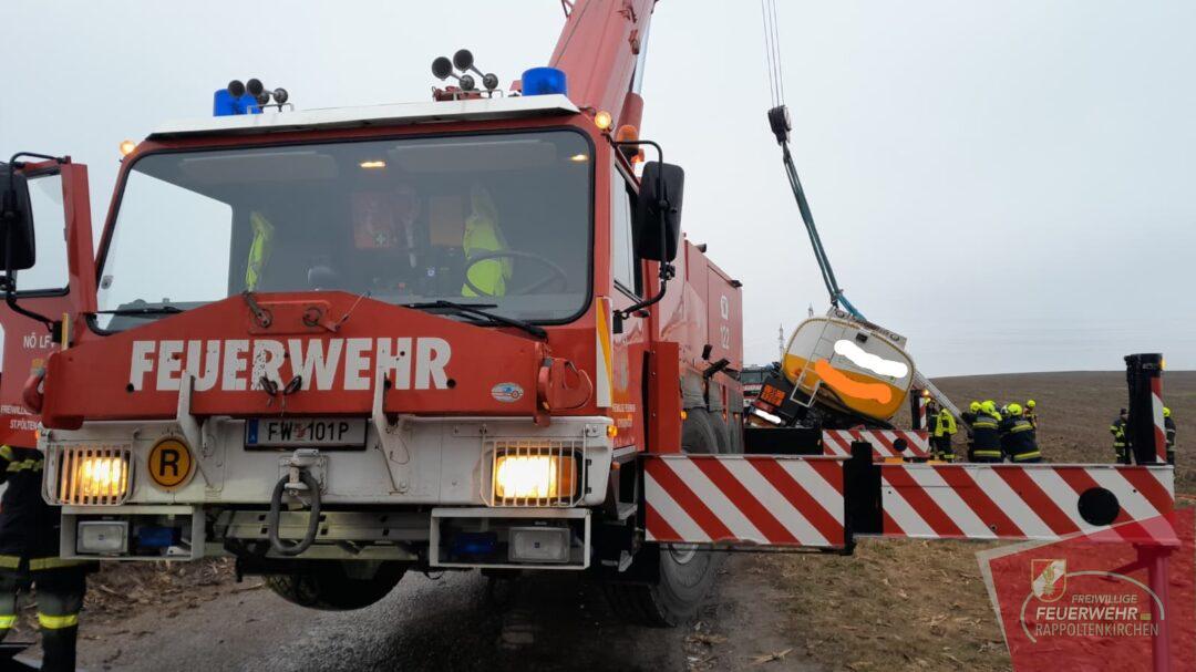 Nach der ersten Lageerkundung und der Abstimmung mit dem Unternehmen wurde zur Bergung ein Kranfahrzeug der Feuerwehr St. Pölten-Stadt nachgefordert.