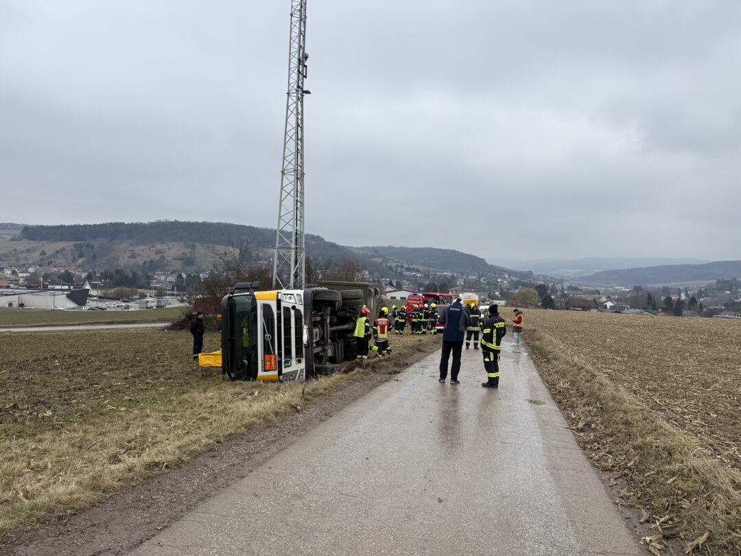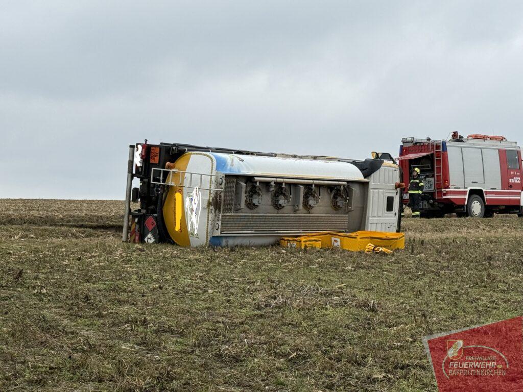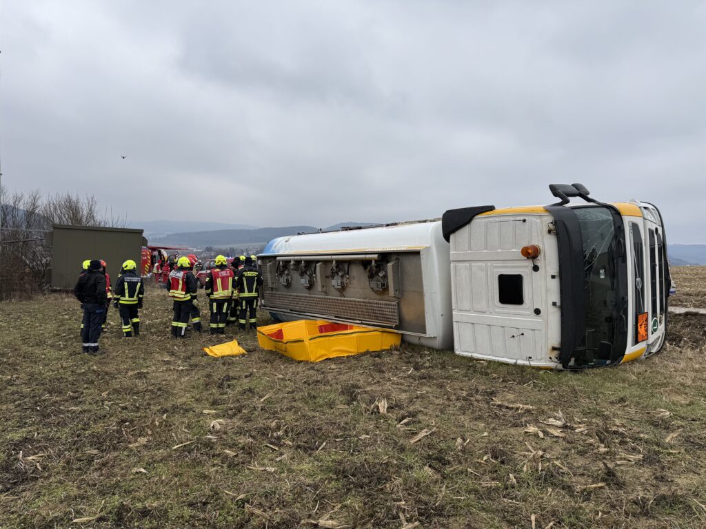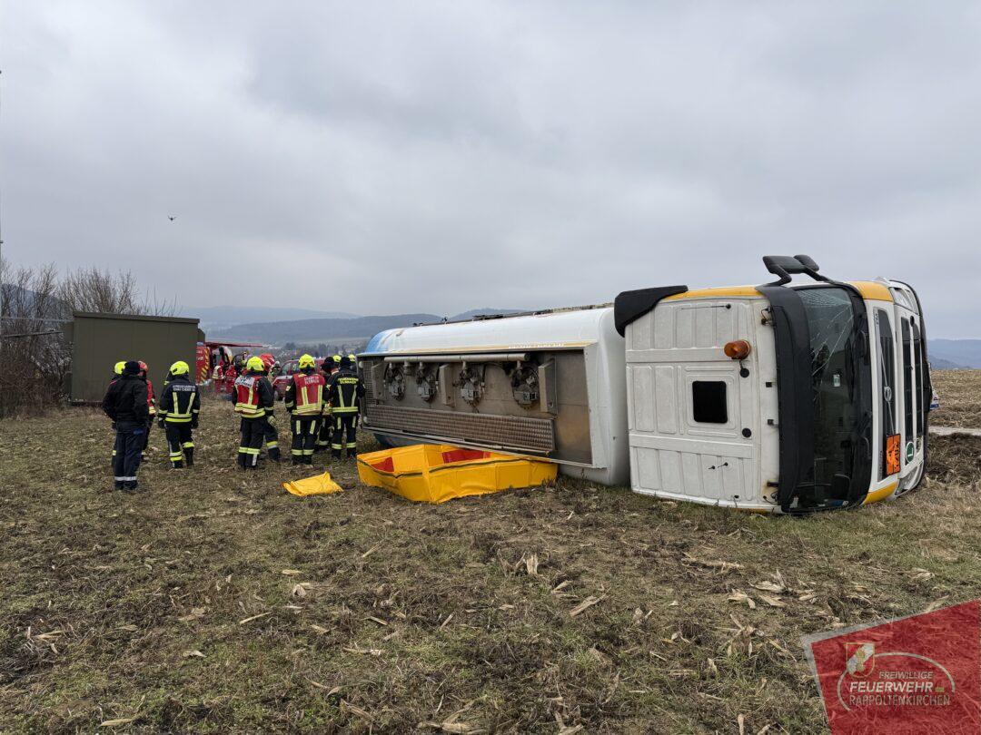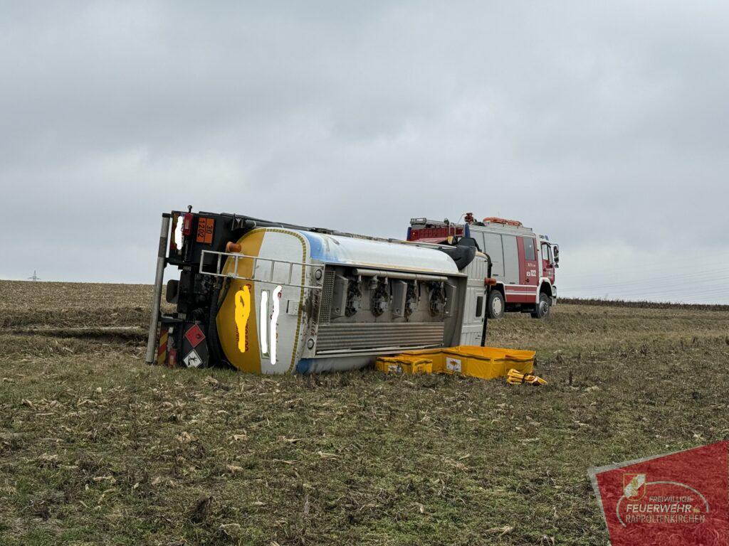 Am 19.2. wurden wir um 11:06 Uhr zu einem Verkehrsunfall mit einem Gefahrenguttransporter im Bereich der Feldgasse (Sieghartskirchen) gemeinsam mit der FF Sieghartskirchen und anderen Feuerwehren alarmiert. Ein mit rund 7.000 Litern Diesel beladener LKW war aus bislang unbekannter Ursache ins Bankett geraten und in weiterer Folge umgestürzt. Der Lenker blieb glücklicherweise unverletzt, und auch der transportierte Treibstoff trat nicht aus.
