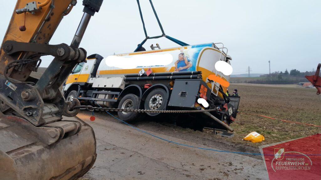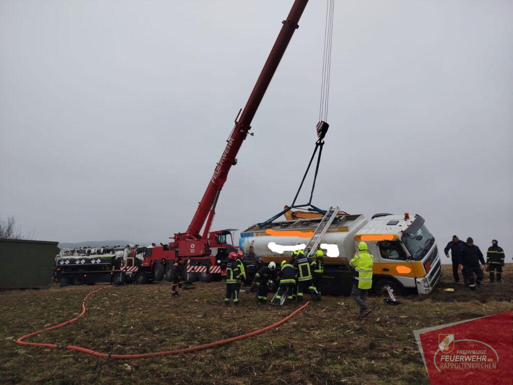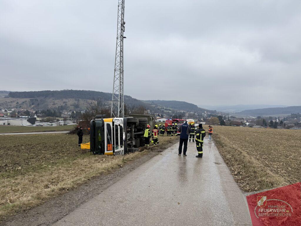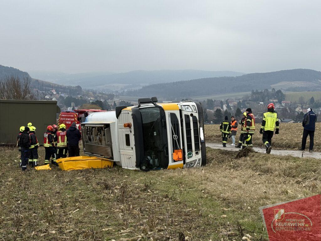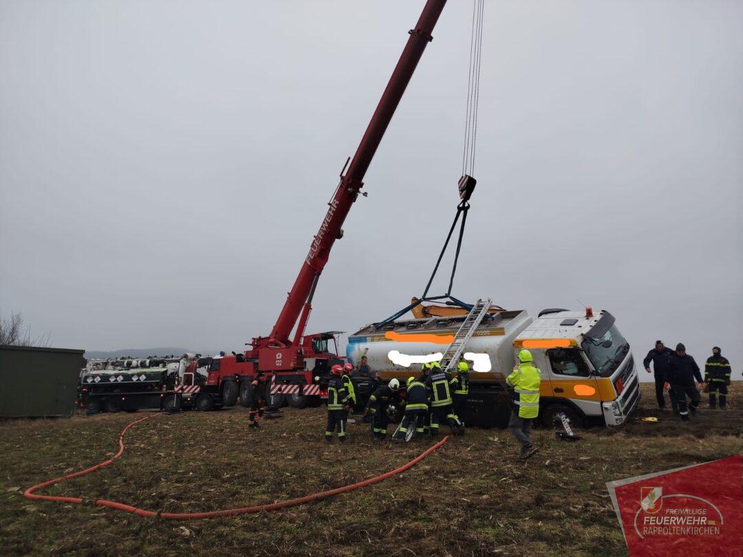 Am 19.2. wurden wir um 11:06 Uhr zu einem Verkehrsunfall mit einem Gefahrenguttransporter im Bereich der Feldgasse (Sieghartskirchen) gemeinsam mit der FF Sieghartskirchen und anderen Feuerwehren alarmiert. Ein mit rund 7.000 Litern Diesel beladener LKW war aus bislang unbekannter Ursache ins Bankett geraten und in weiterer Folge umgestürzt. Der Lenker blieb glücklicherweise unverletzt, und auch der transportierte Treibstoff trat nicht aus.
