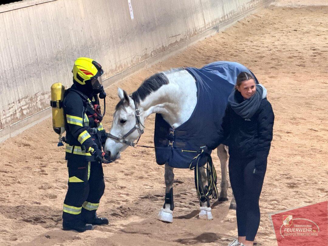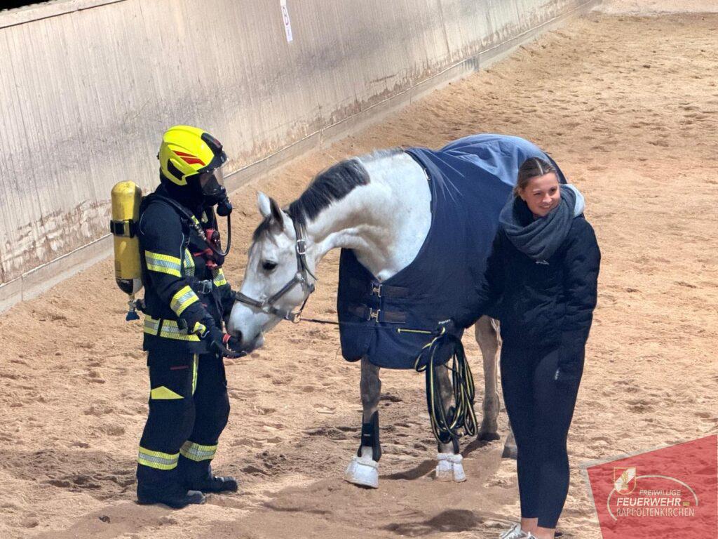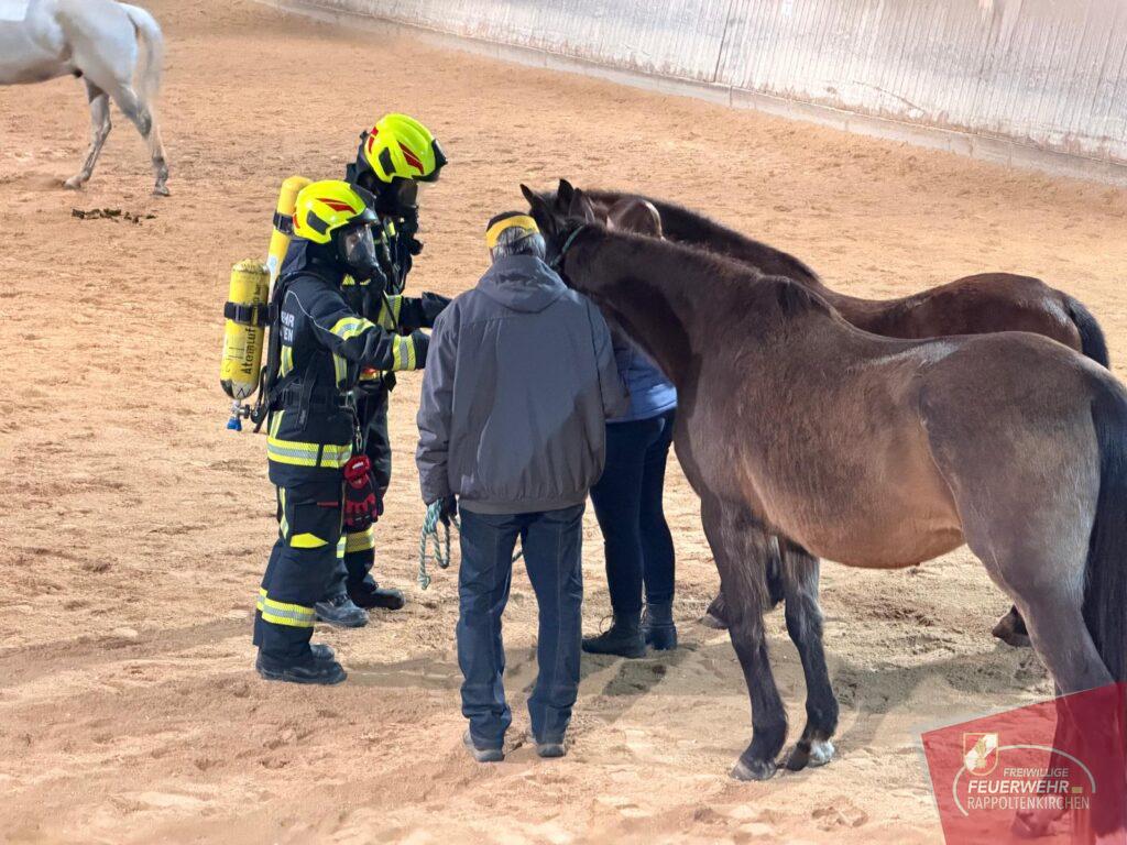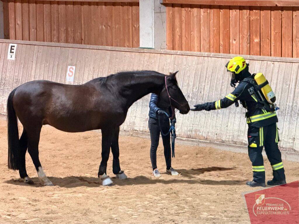 Im Mittelpunkt stand anschließend die praktische Arbeit mit den Pferden. Ausgerüstet mit Atemschutz näherten sich die Einsatzkräfte den Tieren, um sie behutsam an die ungewohnte Ausrüstung zu gewöhnen. Ziel war es, Vertrauen aufzubauen und den Pferden die Angst zu nehmen.